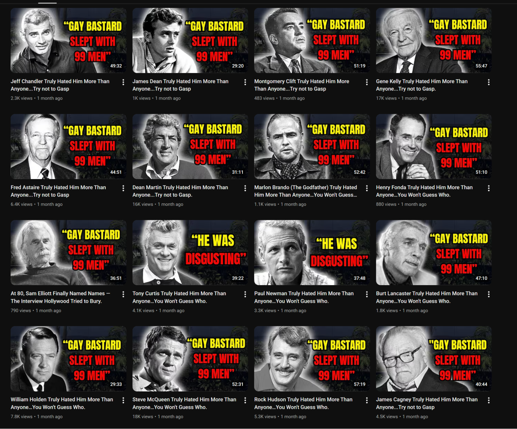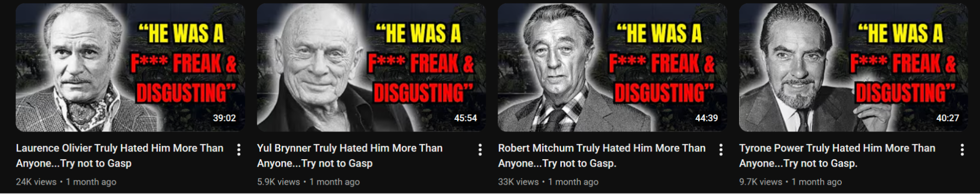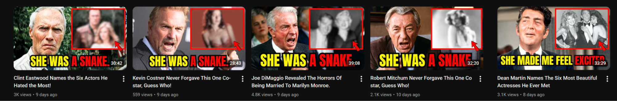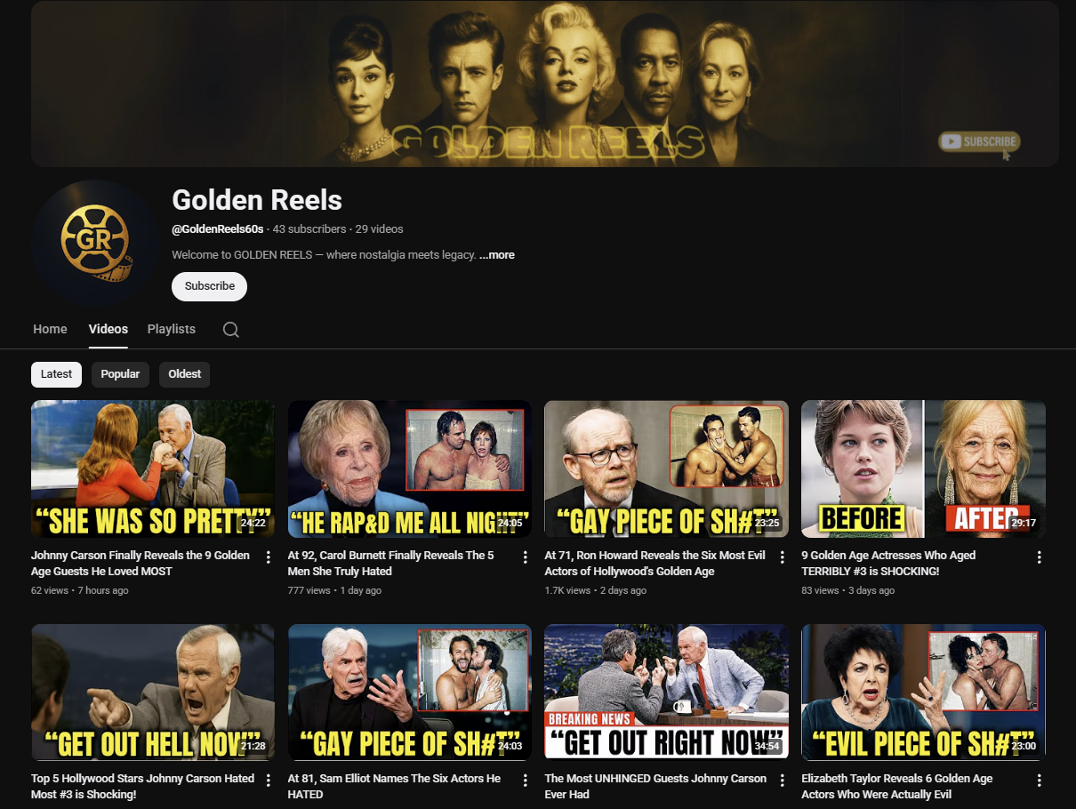 Most of the content centers around golden-age movie stars dropping absolute bombs of fake messy gossip as they near death. The actual videos are AI narration over a slideshow of Google image search results of the celebrities.