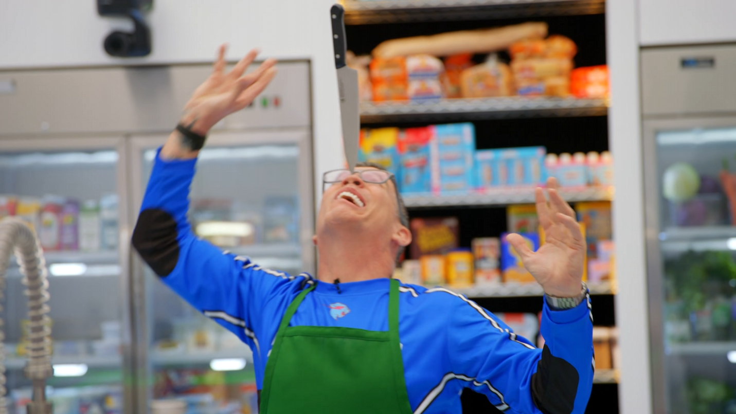 At one point Steve-O grabs a chef’s knife and balances on the tip of his nose.